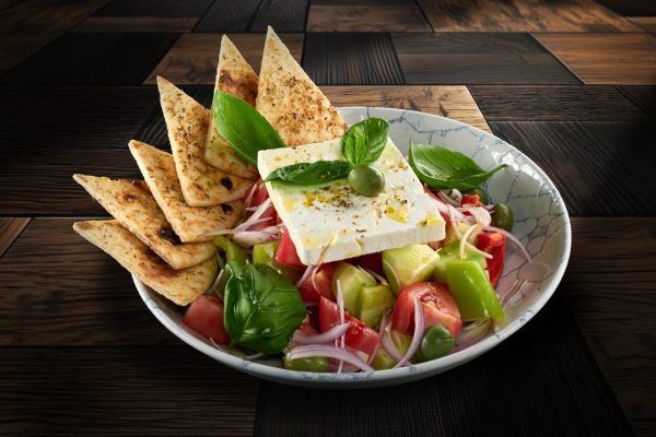 Grčka obrok salata sa svežim povrćem. maslinama i autentinom grčkom fetom od ovčijeg i kozijeg mleka