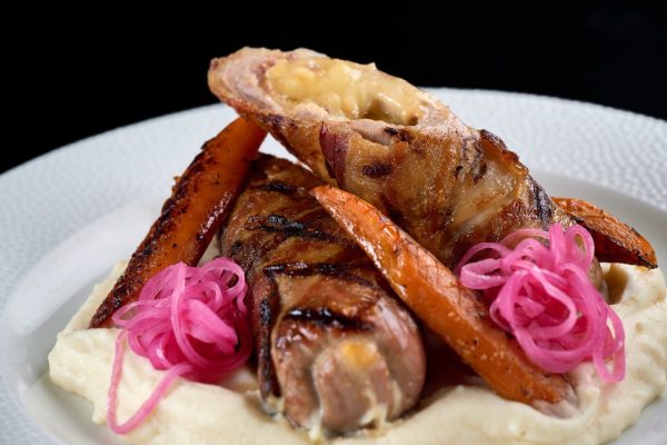Svinjski file punjen dimljenim sirom, rolovan slaninom poslužen na kremastom pireu od karfiola