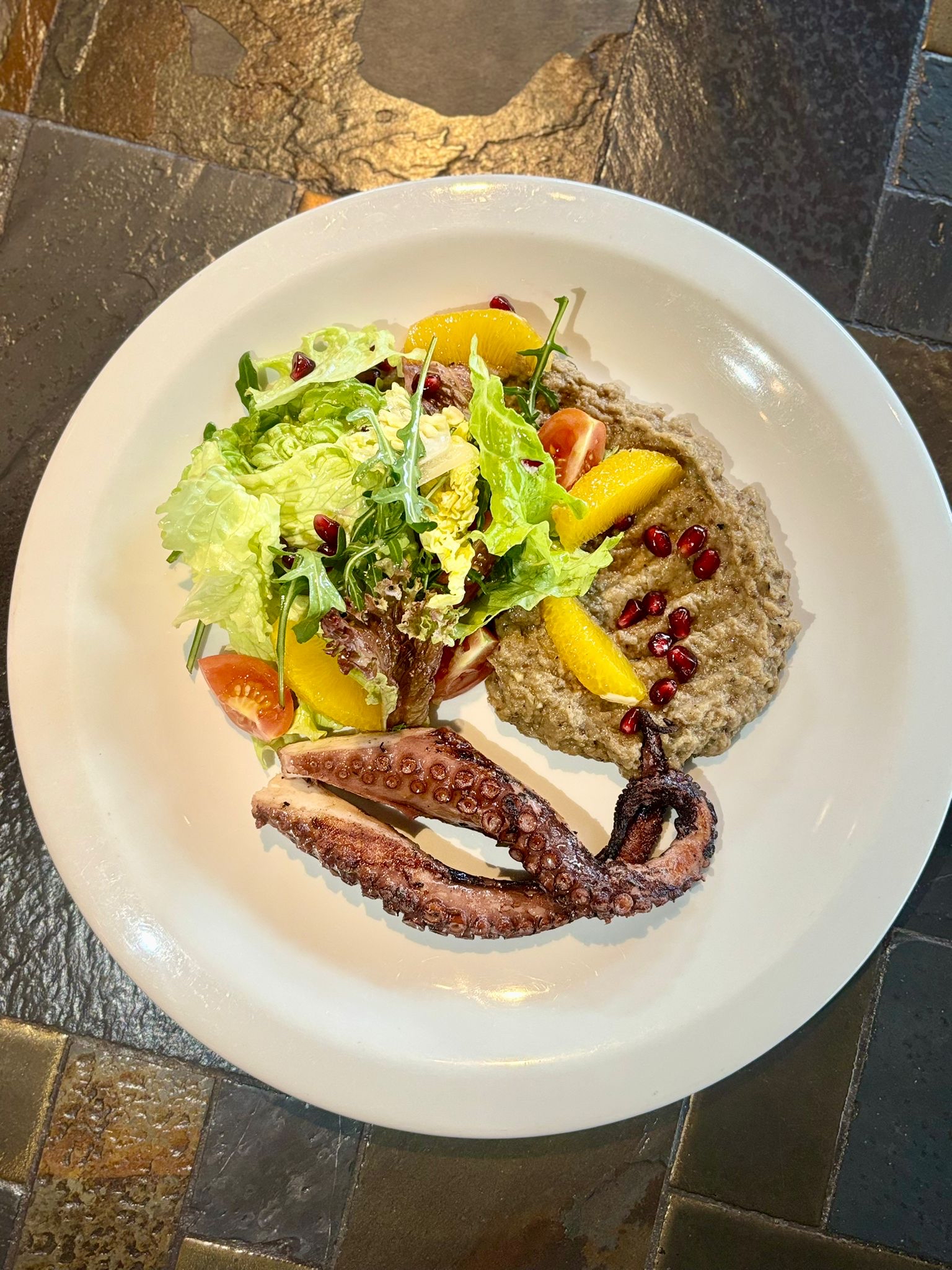 Grillezett polipcombok római salátával, hagyományos levantei padlizsánnal és tahinivel, friss naranccsal, gránátalmával és aromás kenyérrudakkal