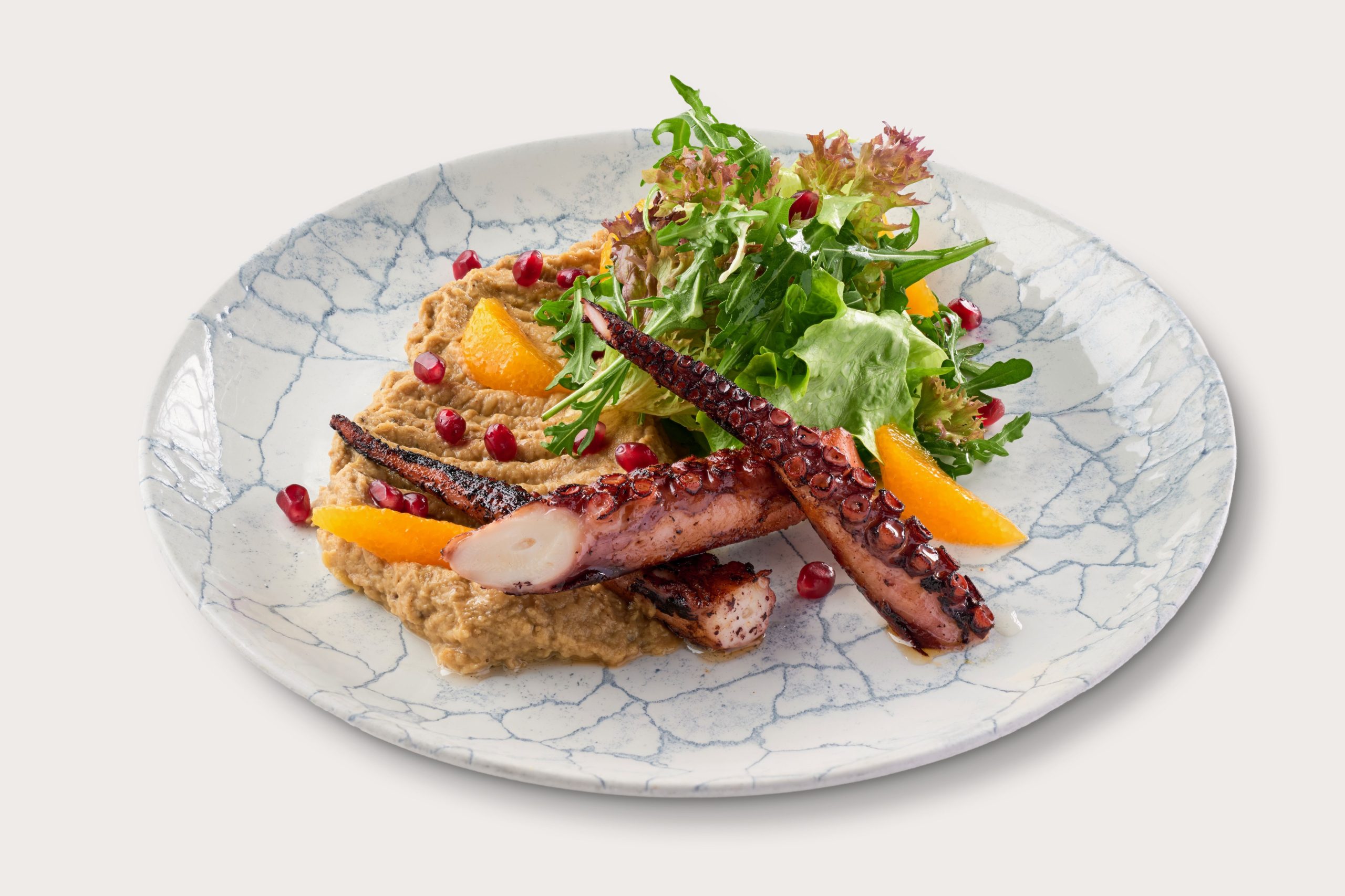 Grilovani kraci hobotnice poslužene sa romana salatom, tradicionalnim levantskim namazom od patlidžana i tahinija, svežom pomorandžom, narom i aromatičnim štapićima hleba