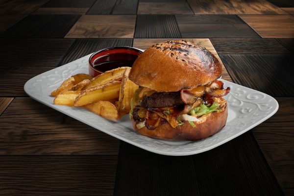 Čisto juneće meso sa kentucky sosom, karamelizovani luk, kiseli krastavci, slanina i čedar sir